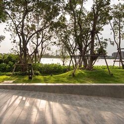 The landscape design idea is derived from the Thai concept of “Bang”. The word “Bang” refers to the settlement areas along the naturally formed distributary canal of the river. The landscape architects interpreted the concept of “Bang” to form a central green space that was integrated into the surrounding modern residential buildings.