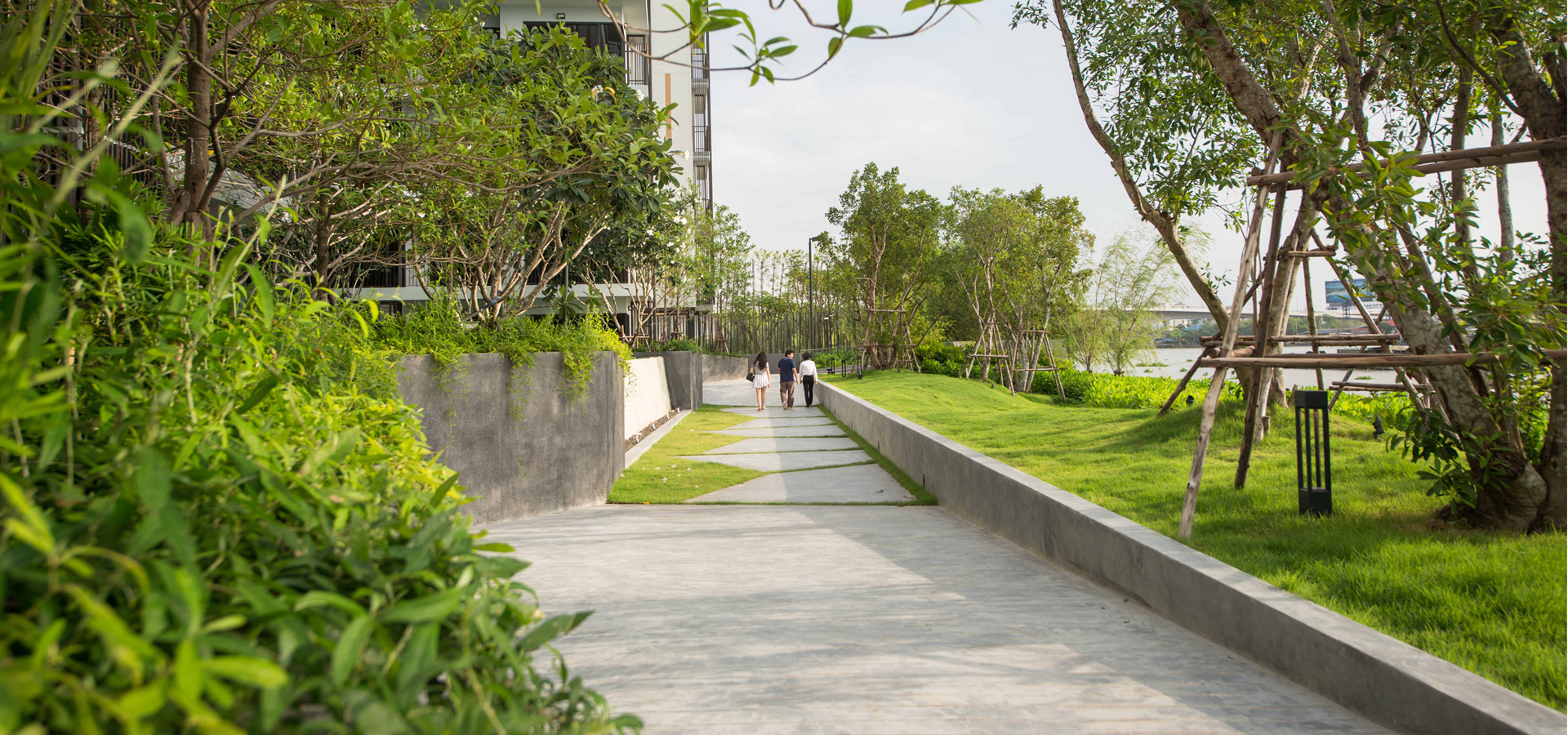 ทางเดินคอนกรีตริมน้ำ ลดระดับลงต่ำกว่าพื้นที่สีเขียวริมเขื่อน เพื่อลดการไหลของน้ำจากพื้นที่ดาดแข็งในโครงการสู่แม่น้ำ และออกแบบให้เกิดลวดลายโดยการใช้หญ้าเพื่อให้น้ำที่ไหลจากน้ำฝนได้ซึมลงไปในดิน พื้นที่ริมน้ำได้ถูกออกแบบเพื่อให้ผู้อาศัยได้สัมผัสถึงลมไอเย็นจากแม่น้ำและดื่มด่ำไปกับทัศนียภาพอันงดงามยามพระอาทิตย์อัสดง