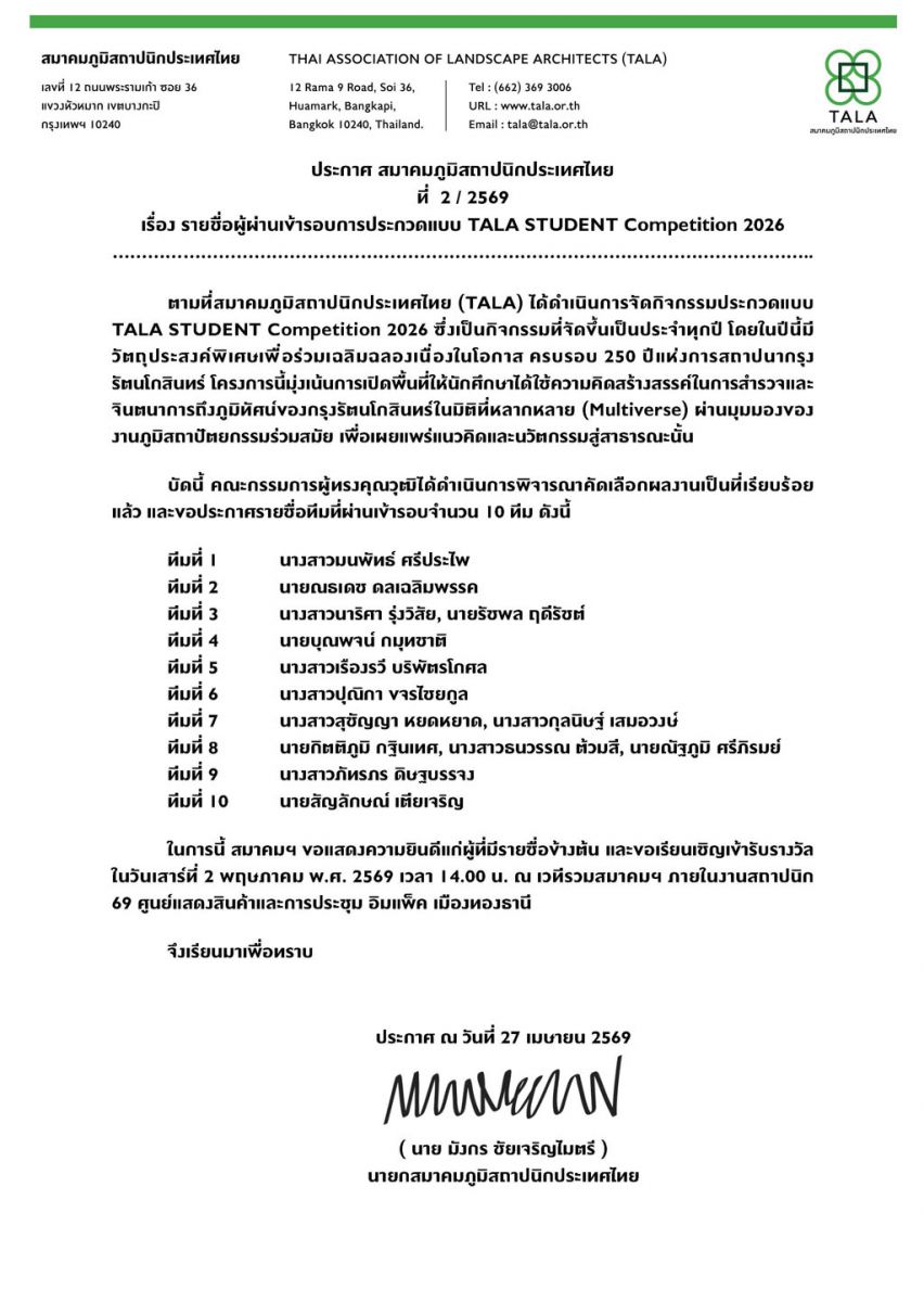 รายชื่อผู้ผ่านเข้ารอบประกวดแบบ TALA Student competition 2026